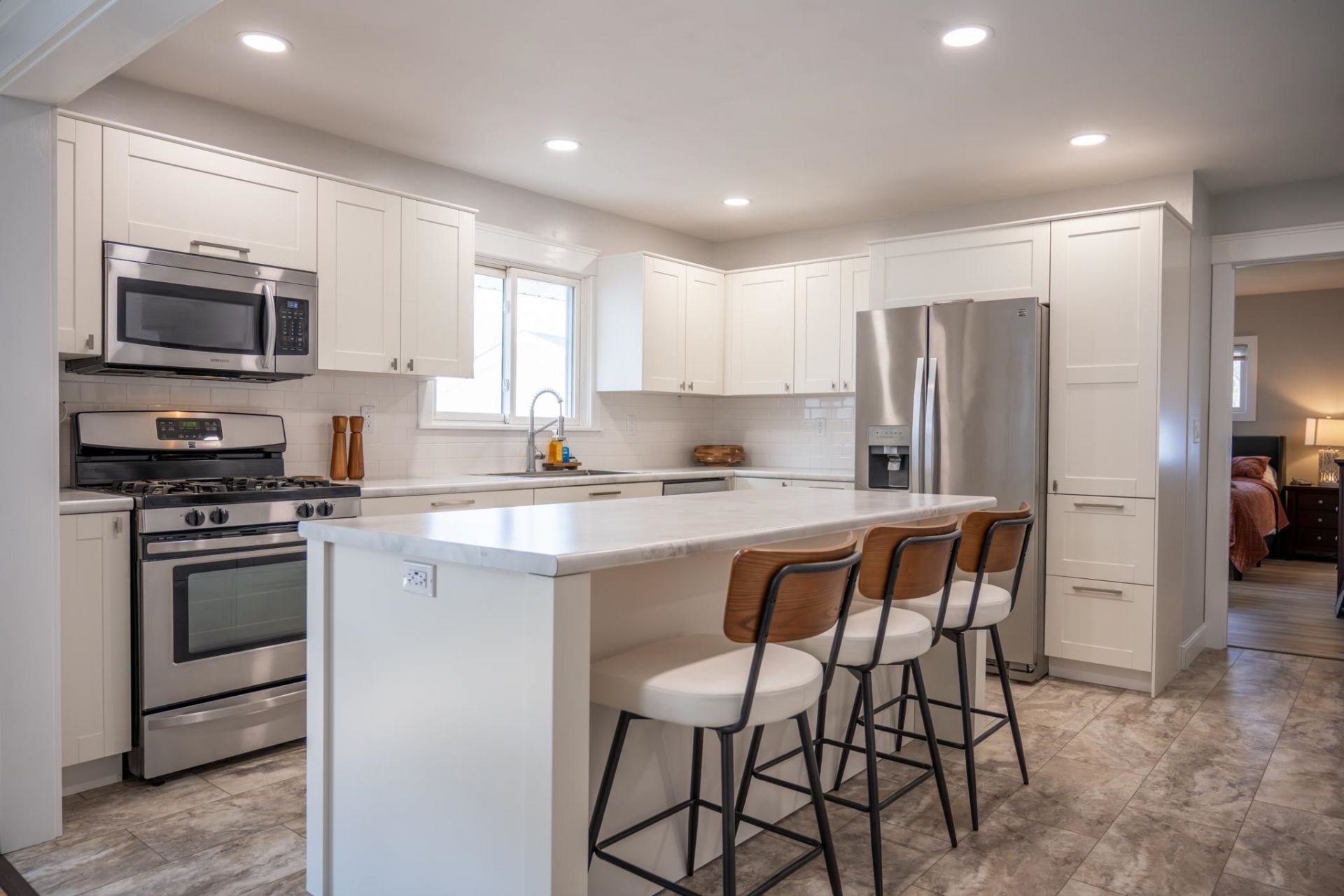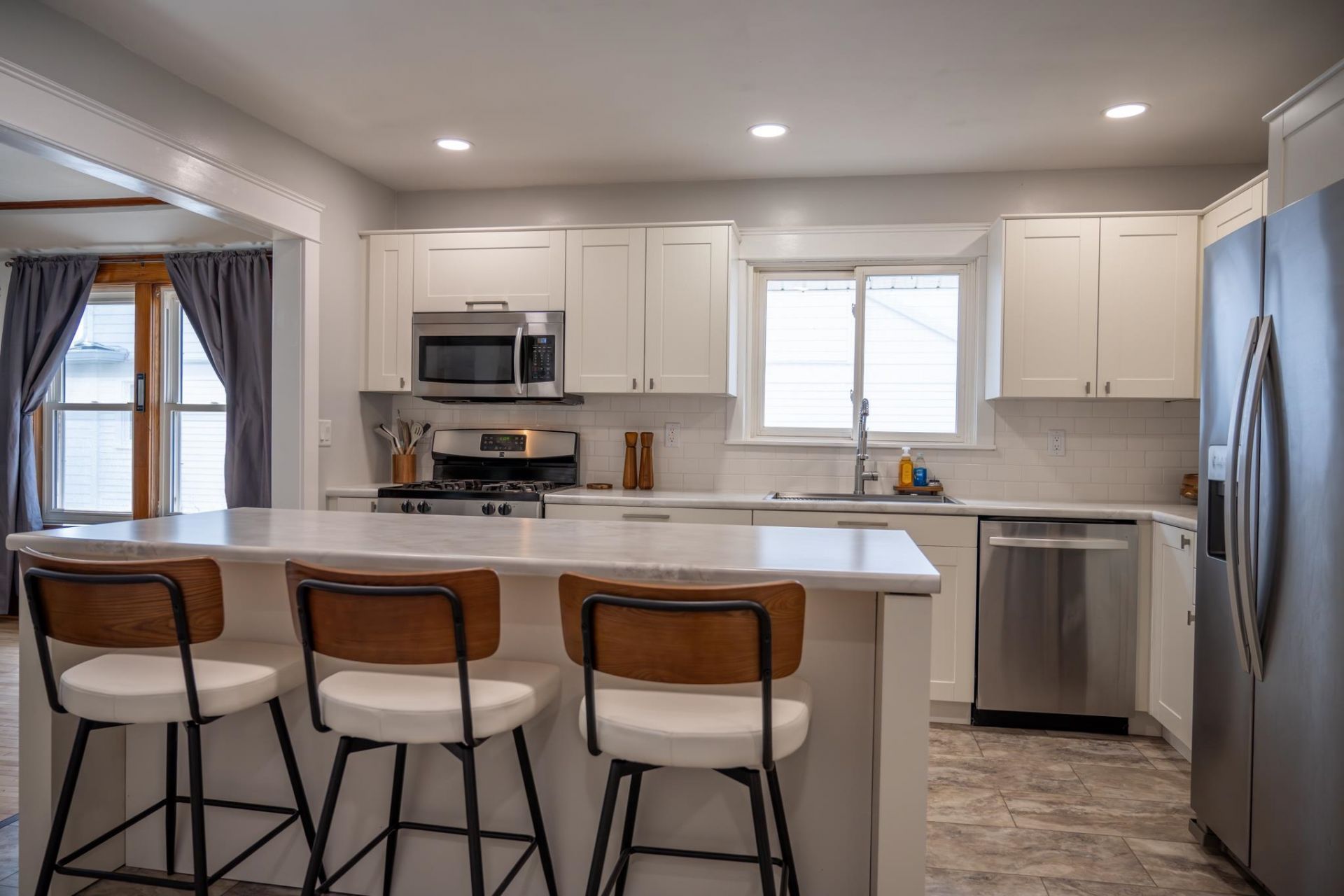 Step into this charming 3 bedroom, 2 bathroom home where classic character meets contemporary elegance. The expansive living area flows seamlessly into the dining room, beautifully accented by original wood pillars that define the space without closing it off and maple hardwood floors. At the heart of the home, a completely remodeled modern kitchen serves as a showpiece, featuring a large center island with additional seating that opens directly to the dining area for effortless entertaining. The primary suite offers a private retreat with its own ensuite bathroom and walk-in closet, while two additional bedrooms share a clever pass-through bathroom providing the convenience of a private suite for guests. Morning coffee could be enjoyed in the sun-drenched front sunroom, a perfect sanctuary for relaxation. Practicality meets ease with an attached one car garage and a perfectly sized fenced in yard designed for minimal upkeep and maximum enjoyment.