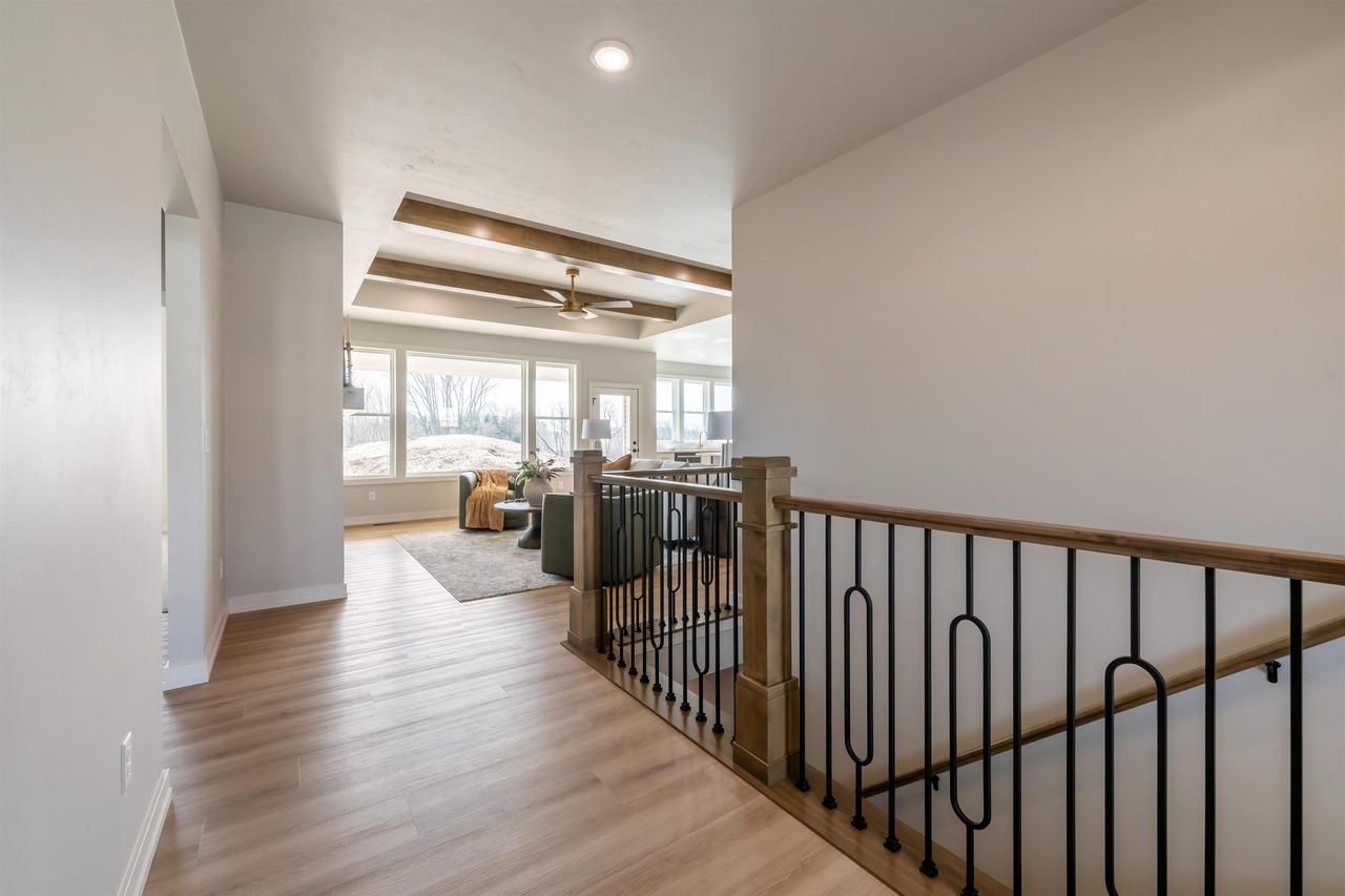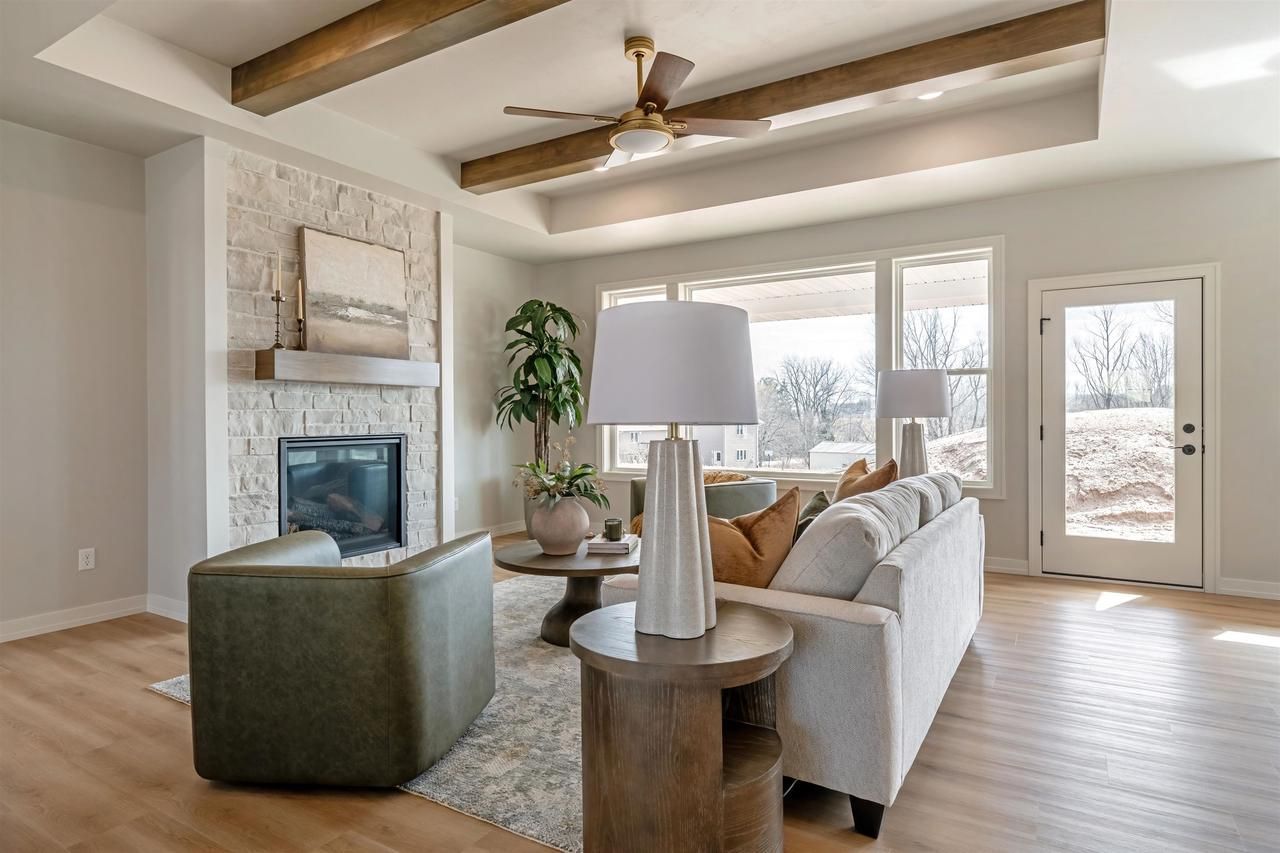 Gorgeous Showcase Home! As you step inside, you'll be greeted by the warmth & coziness of the Great Room, complete w/stone Fireplace & beamed tray ceiling. Welcoming kitchen is impressive w/large center island, sink overlooking amazing yard, quartz counters, tile backsplash & pantry. Relax in the spacious primary suite complete w/tray ceiling, WI closet & primary bath w/dual sinks & WI tile shower. Step outside to your own outdoor oasis with gorgeous view to enjoy morning coffee or evening barbecues. Finished spacious 3-car garage that provides basement access, you'll have all the room you need for vehicles, hobbies & storage. LL allows for future expansion w/egress window & is stubbed for bath. Move in & enjoy!