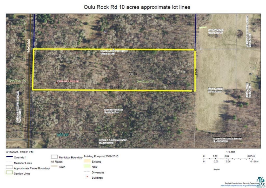 Ten +/- wooded acres of Northern Wisconsin waiting for you. Tall birch and mixed hardwoods, abundant wildlife, and the peace and quiet of the Town of Oulu. Conveniently located near Brule, WI, home of the world-famous Brule River, and Iron River offering dining, shopping, and everyday amenities. Wetland determination completed, upland building sites available. Electricity across the street and fiber available. Perfect hunting land, cabin site, or long-term investment. Zoned F-1 Forestry. Seller to split approximately 10 acres from Tax ID 39348. Southern boundary flagged from adjacent previous survey.